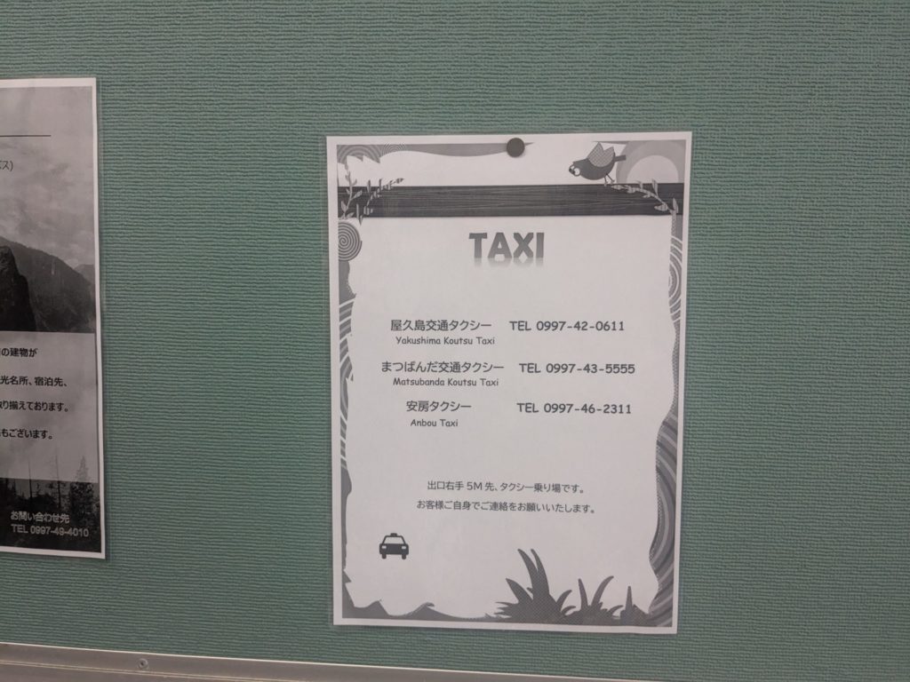 空港内掲示。島内のタクシー会社さんの連絡先