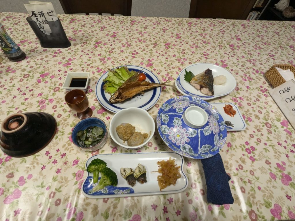 夕食付でお願いして正解。毎食、お魚を中心としたお料理を出してくれる。写真は、席についてすぎに撮影したから品数少ないけど、ここにプラスして白米、お刺身、お味噌汁、デザードを毎回つけてくれる。